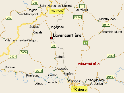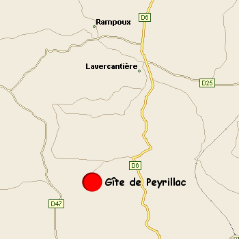 Le gîte de Peyrillac est situé dans le hameau de Peyrillac à 1,5 km de Lavercantière en pays de la Bouriane dans le Lot à 20 km de Gourdon et 30 km de Cahors. Lavercantière est situé sur l'axe Paris-Toulouse, à environ 500 km de Paris, 150 km de Limoges et 120 km de Toulouse. Carte Michelin n° 337 - pli D4 Coordonnées GPS :